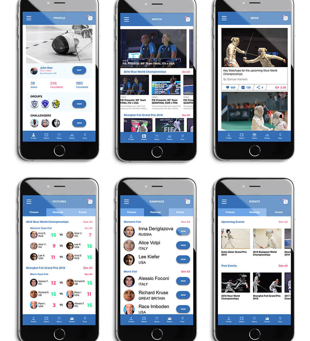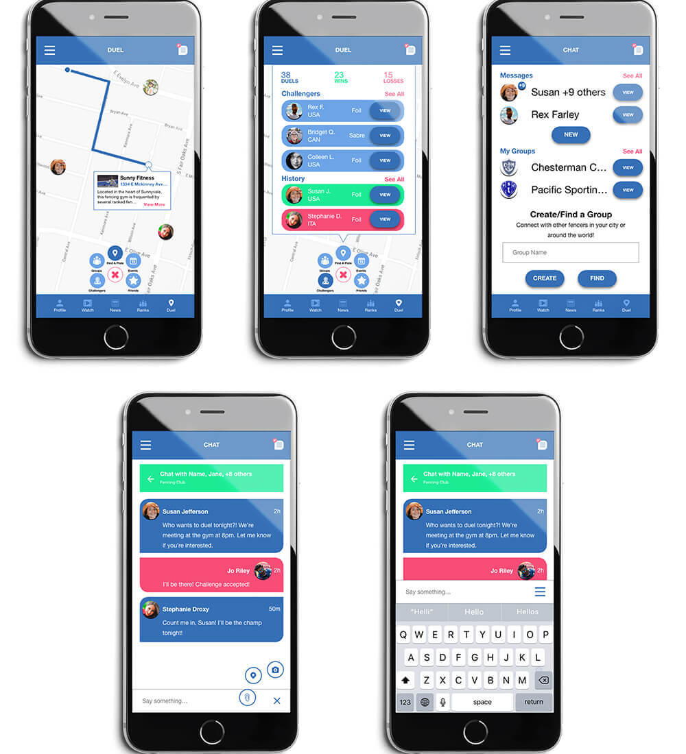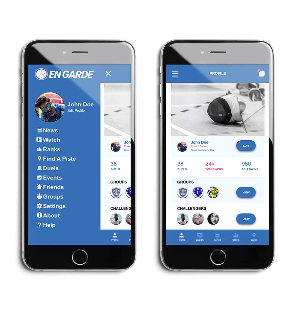 En Garde is a concept company/mobile application that I created as a personal project. The core feature of the En Garde app is to locate nearby fencers and challenge them to a duel. The map allows you to locate the nearest piste to conduct the duel and allows you to see anyone who is actively searching for a match. The chat screen is also a core feature of the app to increase community engagement. The chat screen is accessible on every screen throughout the app so that the user can constantly be in contact with their friends or group. The app also features a ranking system, a replay page, a news page, and an events page.