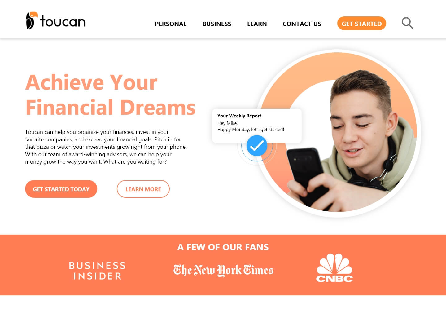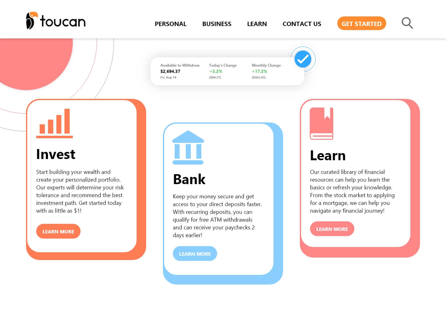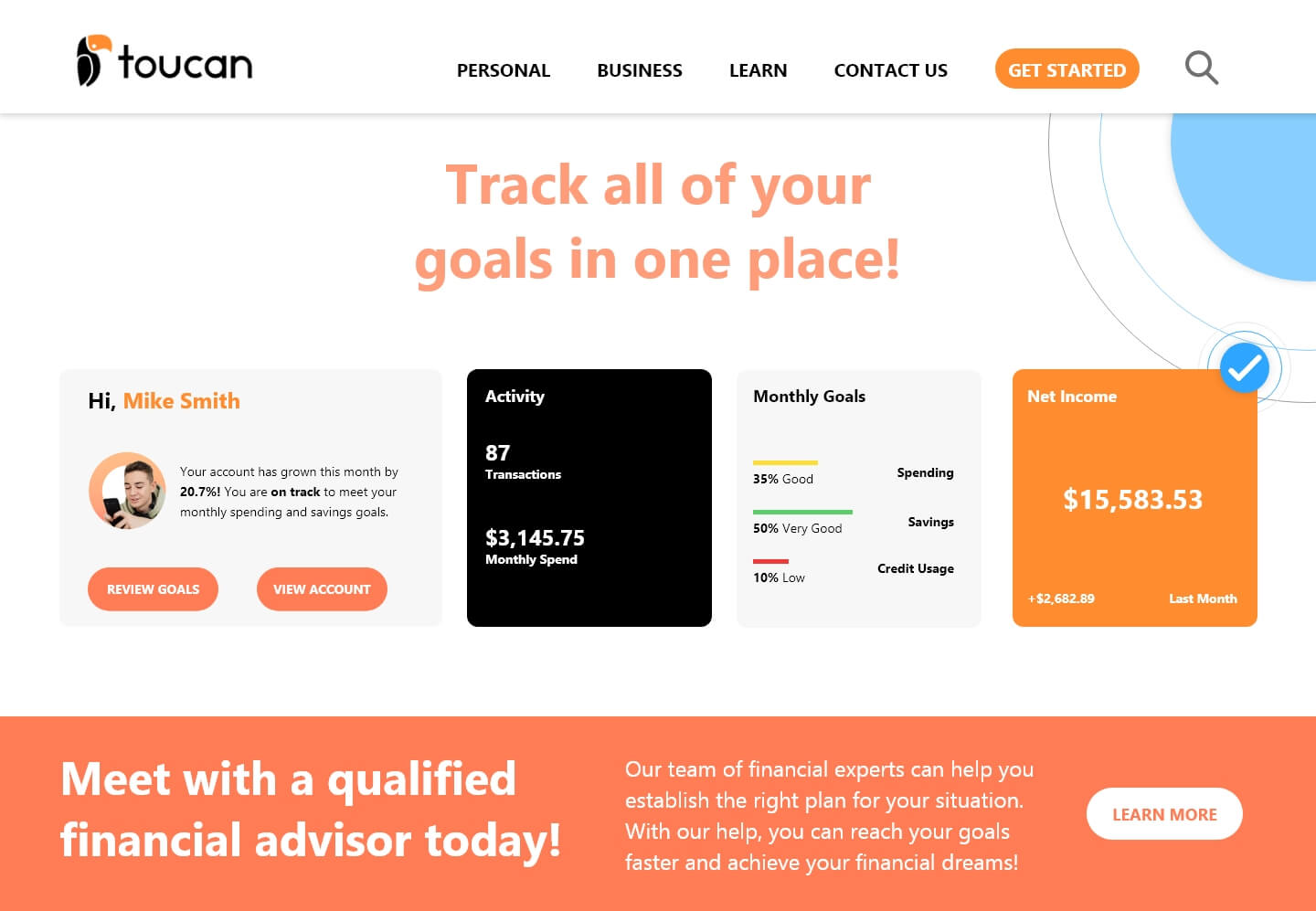 Toucan Finance is a concept company that I created as a personal project. Toucan is a banking and wealth management platform that allows users to track their finances and investments. Clients are able to partner with a licensed financial advisor and create customized goals to ensure they reach their financial dreams. A key aspect of this project was to keep the design simplistic yet inviting so the user can feel engaged and trust the platform.